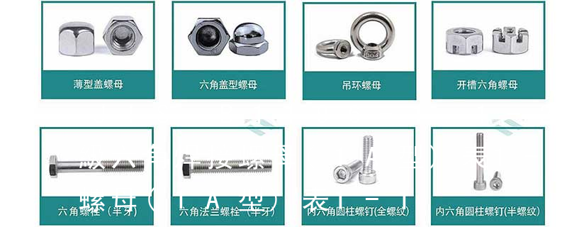 1、不銹鋼國標螺母的標準尺寸為M1.6-M64。不銹鋼國標螺母包括:六角螺母(GB6170/DIN934)、薄螺母(GB6172/DIN439)、重型螺母(公制、美制)、尼龍鎖緊螺母(DIN985-DIN982厚型)、全金屬鎖緊螺母(DIN980M),蓋型螺 1型六角開槽螺母-A和B級GB 6178-86 1型六角開槽螺母-C級GB 6179-86 2型六角開槽螺母-A和B級GB 6180-86 六角開槽薄螺母-A和B級GB 6181-86 2型非金屬嵌件六角鎖緊螺母GB /T 6182-2000 非金屬嵌件六角法蘭面鎖緊